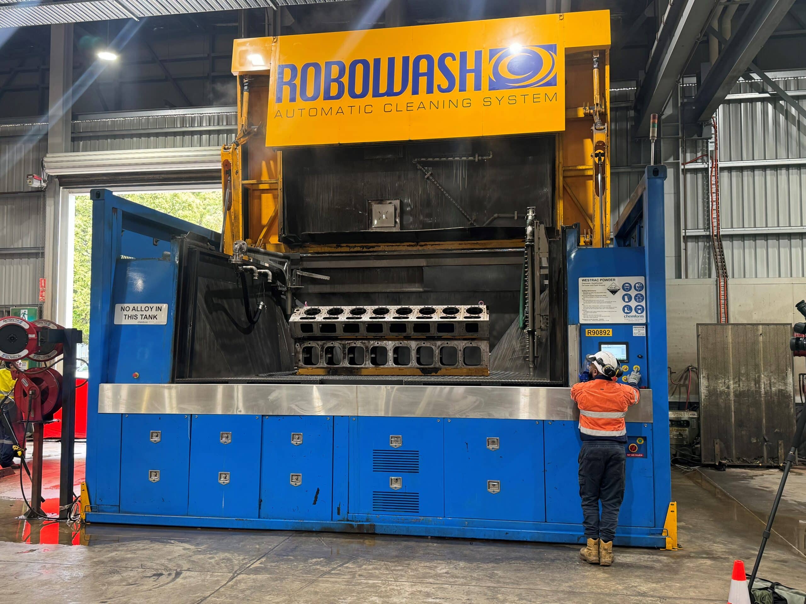 The R9 Robowash machine is a capable of cleaning the largest industrial engine and components available, including C175 and 3500 Caterpillar engines internally as well as externally. Capable of using caustic soda for cleaning and paint removal and combined with gas heating which eliminates heat up times between wash cycles and high impact spray nozzles, there is simply no other method of cleaning heavy industrial components with such capacity.
